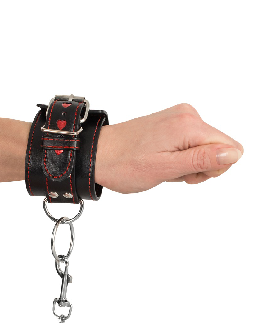 Esposas románticas en cuero sintético – Con corazones troquelados y cadena extraíble (ajustables)