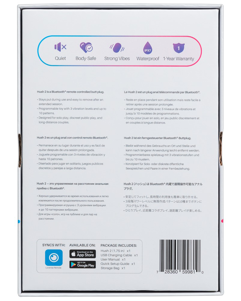 Fabricado en silicona médica ultrasuave, el Hush 2 se adapta perfectamente al cuerpo y ofrece vibraciones profundas e intensas, ideales para el placer anal prolongado. Puede controlarse manualmente o a través de la Lovense App, que permite personalizar la intensidad, crear patrones de vibración ilimitados, sincronizarlo con música o incluso dejar el control a tu pareja desde cualquier parte del mundo. Con sus 7 modos preconfigurados y las funciones interactivas de sonido y ritmo, este dispositivo convierte cada uso en una experiencia única y personalizada.