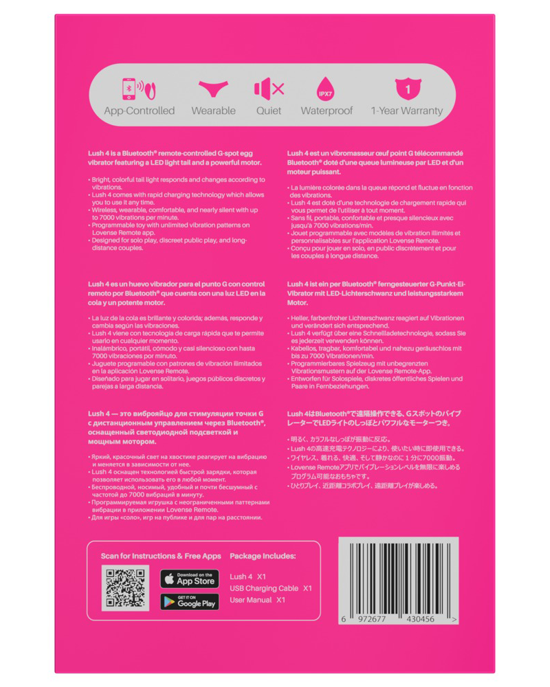 El Lovense Lush 4 es un vibrador de silicona con control por App, diseñado para ofrecer vibraciones profundas y potentes en la zona G. Con hasta 7000 vibraciones por minuto y funcionamiento super silencioso (máx. 36 dB), garantiza placer intenso y discreto tanto en casa como fuera.