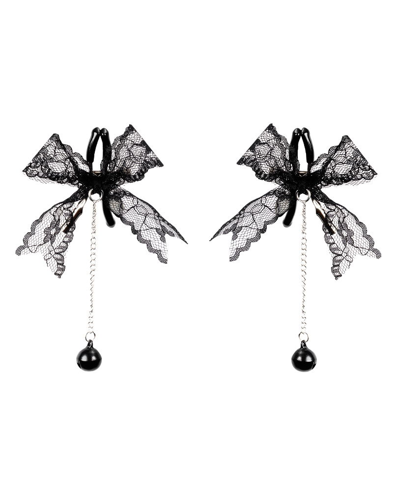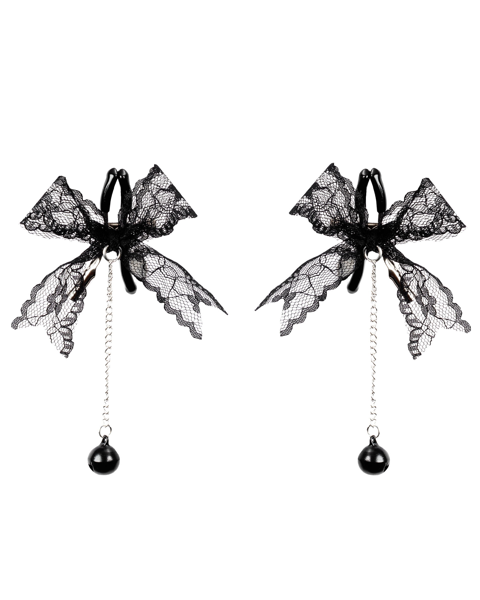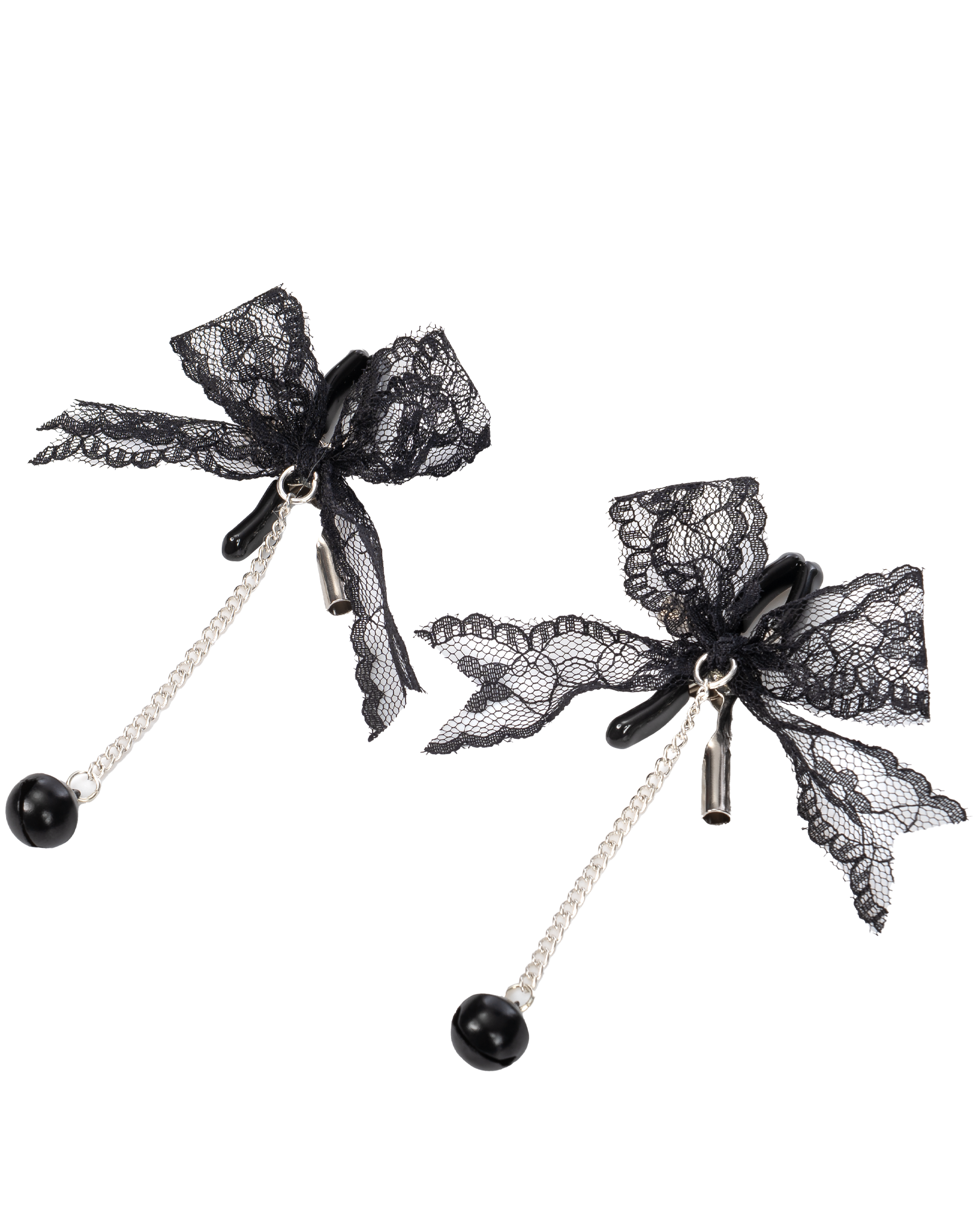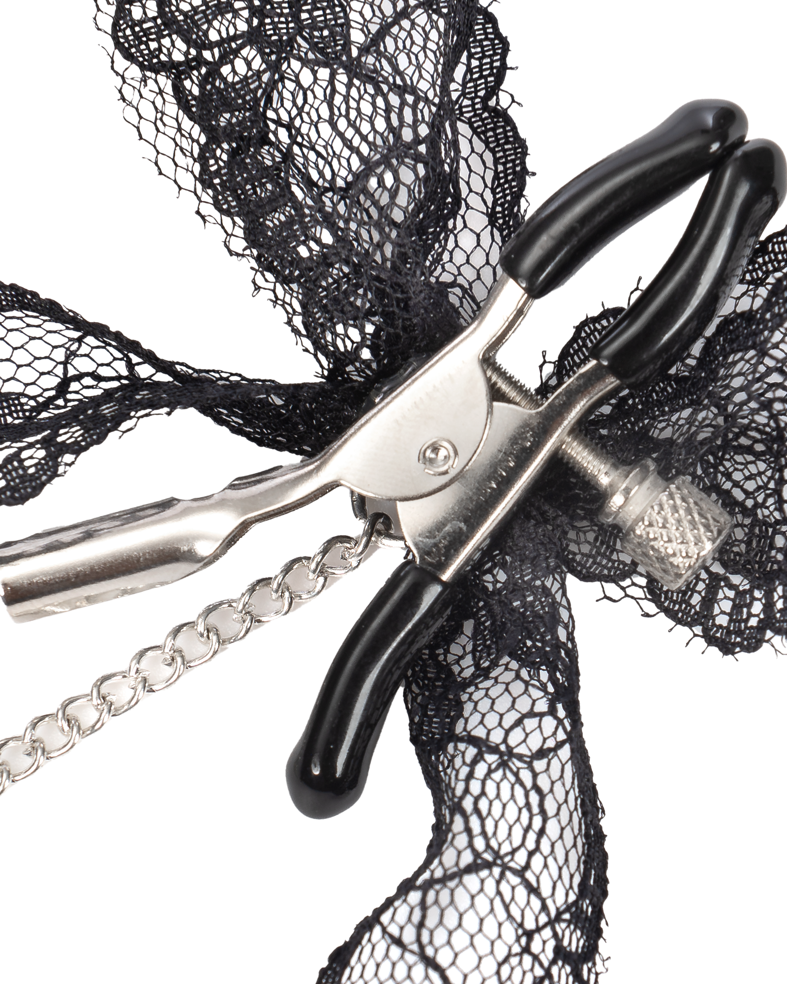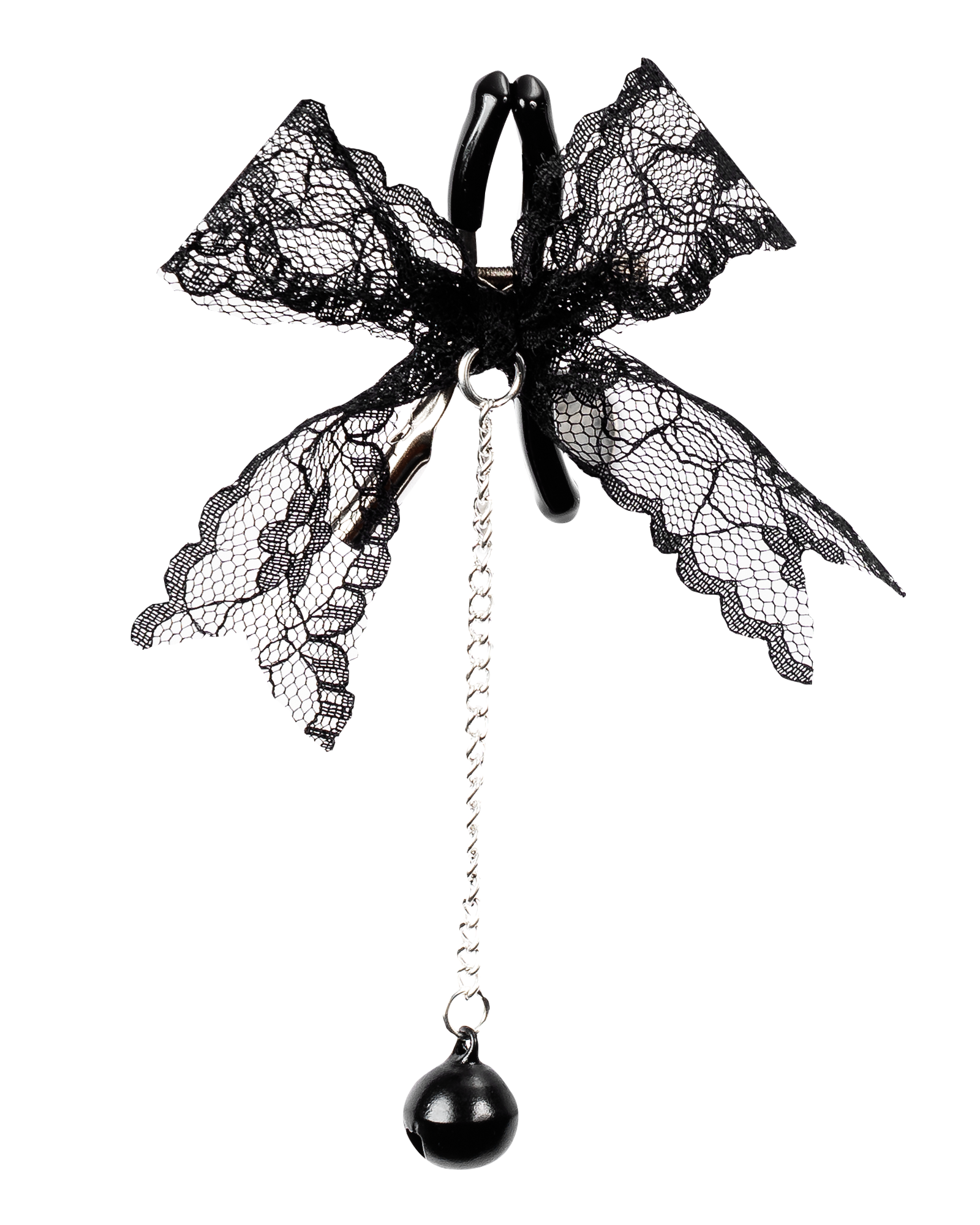 Su presión es completamente ajustable mediante un pequeño tornillo, lo que permite regular la intensidad con precisión para adaptarse a cada nivel de sensibilidad. Las puntas con capuchones de goma desmontables ofrecen una estimulación más suave o más intensa, según el gusto. Cada pinza está adornada con una lazada de encaje negro y un pequeño cascabel colgante unido por una cadena, que emite un delicado sonido al moverse, aportando un toque juguetón y sensual.