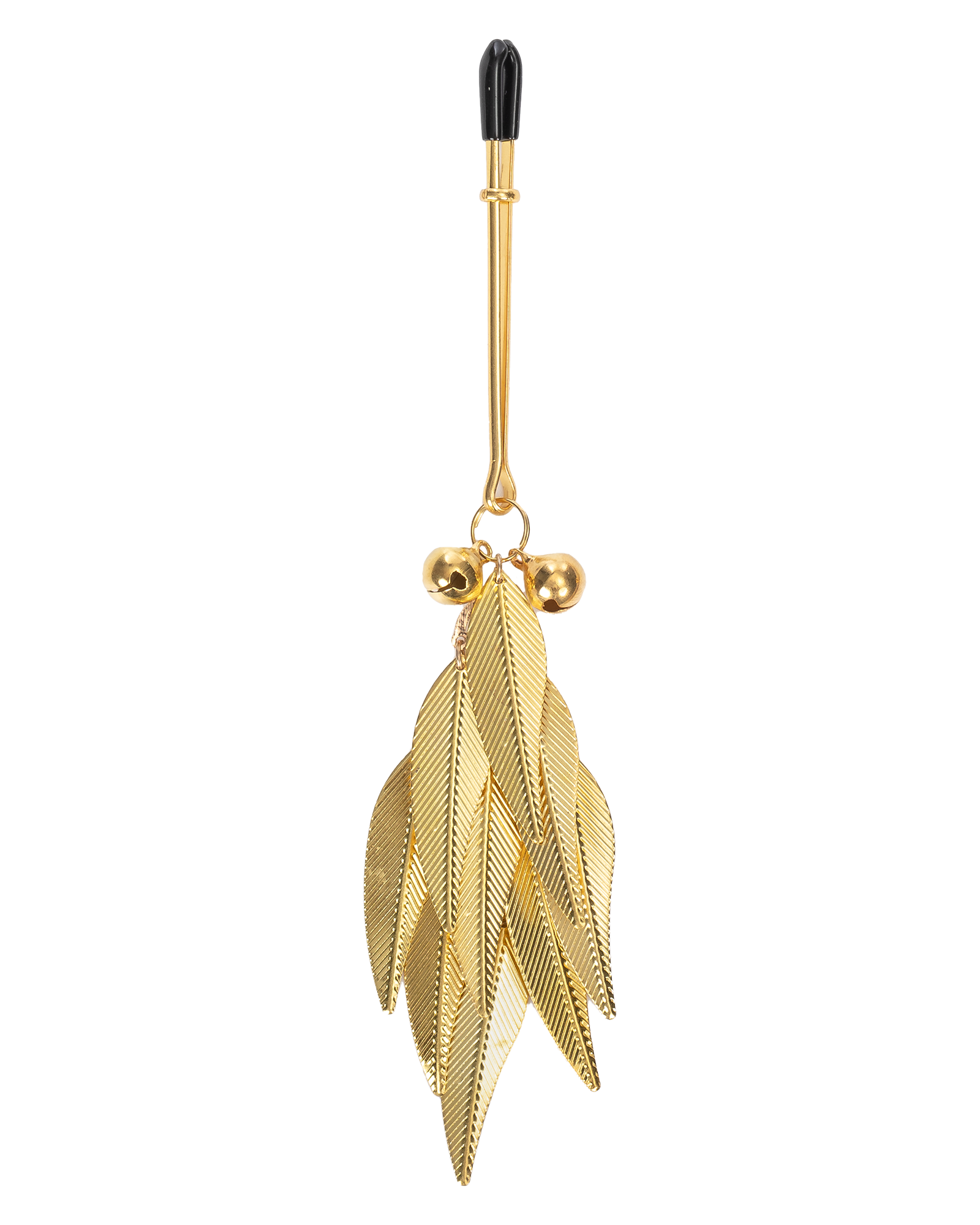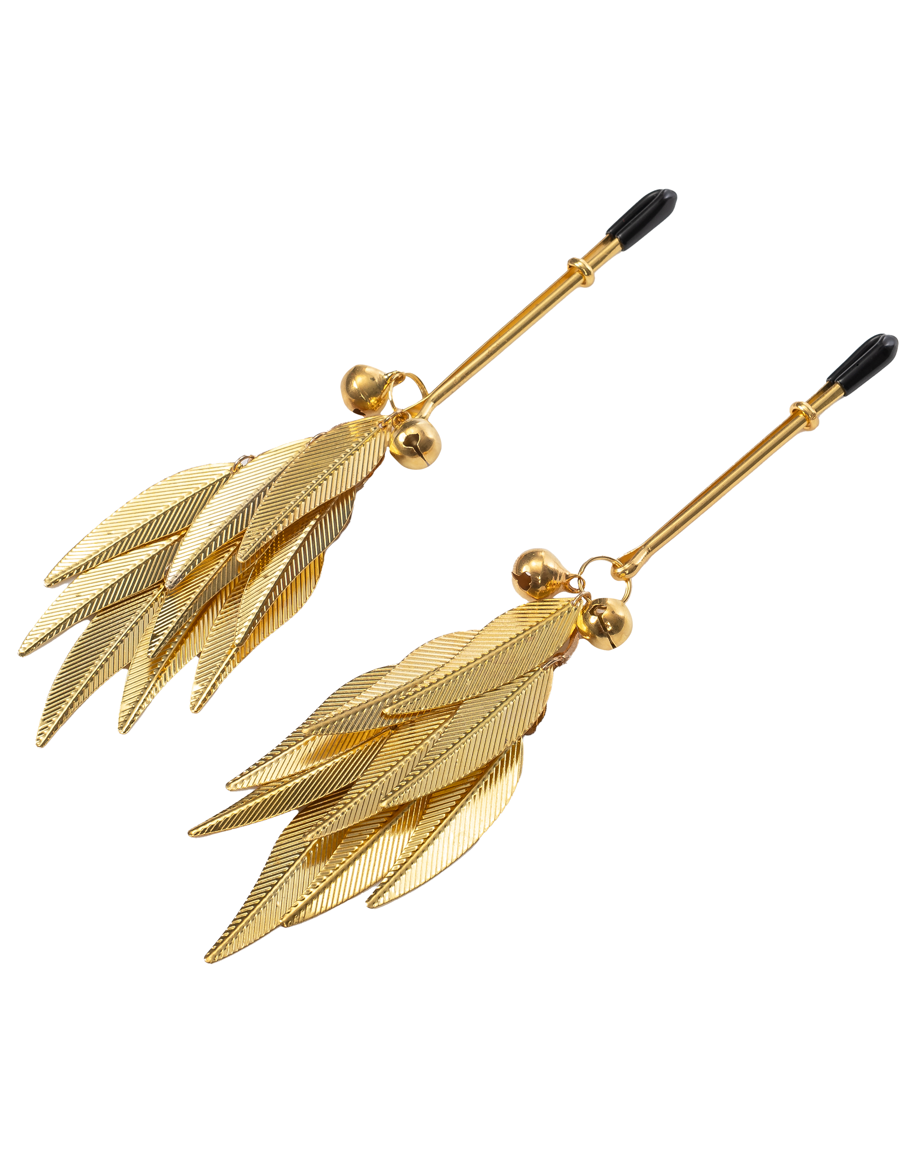 Fabricadas en aleación metálica e hierro dorado, cuentan con un sistema de presión regulable mediante un deslizador, lo que permite adaptar la intensidad según tus preferencias. Las puntas con capuchones de goma desmontables aportan comodidad o, si se retiran, una presión más intensa. Cada pinza está decorada con pequeños cascabeles y un adorno de plumas metálicas doradas, que se mueven con delicadeza ante cada contacto, creando un efecto visual irresistible.